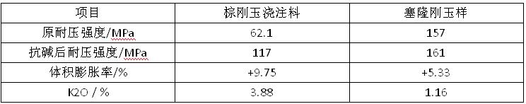 由表1可以看出,要獲得相同的作業(yè)性,粗顆粒、中顆粒、細粉質(zhì)量比為58:22:20的5 #配料用水量較少,各項物理指標也較好。也即增加顆粒的加入量可以提高澆注料的密度。 2.2 α-AL2O3微粉種類選擇和加入量 以5#配比為基礎,試驗選用編號為y、s、z、b、j、c的六種α-AL2O3,微粉做對比試驗,這六種α-AL2O3微粉的粒徑分布和比表面積各不相同。采用的六種微粉盡管粒徑分布不同,比表面積各異,但配制的澆注料的物理性能都能滿足預期要求。相比之下,含微粉 c的配料用水量更小些(3.3%),各項物理指標也較好些。當選用α-AL2O3微粉c,加入量為3%~6%時,配料用水量相同,并且試樣的物理指標也在目標值內(nèi)。 2.3 uf-si02,種類選擇和加入量 本試驗選用國產(chǎn)微粉和?衔⒎圩鰧Ρ仍囼,國產(chǎn)uf-siO2配料用水量3.5%,?蟯f-Si02配料用水量3.3%。澆注料的物理性能見表2。可以看出,要達到相近的流動性,用國產(chǎn)uf-si02時,施工用水量多于用埃肯uf-SiO2的用水量,試驗的各項物理指標都不如用進口微粉的試樣。更為嚴重的是,因為國產(chǎn)微粉雜質(zhì)含量高,1 500℃燒后試樣發(fā)生鼓脹變形,而加進口微粉的試樣1500℃燒后試樣外觀規(guī)整。為了制得質(zhì)量優(yōu)良的預制塊,決定采用埃肯的uf—Si02。 試驗選用埃肯微粉的加入量為3%、4%、5%、6%、7%做對比試驗,試驗結果列于表3。由表3可以看出,當uf—Si02加入量為3%一4%時,施工用水量較大,燒后線變化也較大,當加入量為5%~7%時,施工用水量較小,各項指標也在目標值內(nèi)。 2.4水泥種類和加入量 剛玉預制塊由于位于陶瓷杯中心和風口部位,為保證其良好的高溫性能,由配料引入的ca0必須小于0.5%,所以該澆注料應為性能優(yōu)良的超低水泥澆注料。試驗選用CA一75G和Seacar71兩種純鋁酸鈣水泥做對比試驗,加入量在0.5%~1.5%。結果發(fā)現(xiàn),兩種水泥當加人量為O.5%~1.5%時,各項物理指標都能滿足要求。但前者雜質(zhì)略高于后者,后者性能較為穩(wěn)定,故決定采用seacar71水泥。 2.5配比確定 選用粗顆粒、中顆粒、細粉質(zhì)量比為58:22:20,其中α-AL2O3,微粉加入量為6%,uf-Si02加人量為6%,seacar71水泥加入量為l%制備了棕剛玉澆注料。 棕剛玉澆注料的抗渣結果為:切開坩堝,無明顯的浸蝕滲透現(xiàn)象。 從抗堿試驗來看,剛玉莫來石樣完全潰散,無一完整的。賽隆剛玉樣與棕剛玉澆注料試樣完整無裂紋,其抗堿性試驗結果見表4。棕剛玉澆注料有較好的抗堿性能,但與賽隆剛玉樣相比,抗渣試驗后體積膨脹較大,吸收的K2O也較多。