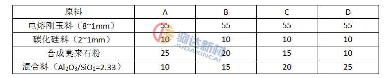 試驗中剛玉骨料為連續級配,碳化硅為<2mm的細骨料,粉料是由氧化鋁、莫來石、氧化硅微粉組成。氧化硅微粉為煙塵粉,粒度<1um,莫來石微粉<5um,氧化鋁為<44um和<5um的粉料。在骨料中,碳化硅的加入量固定為10%,配料中骨料與粉料之比為65:35。而粉料中氧化鋁微粉與氧化硅微粉之比為2.33,由氧化鋁與氧化硅組成的混合料與合成莫來石料之比分別為25:15(A),20:15(B),15:10(C),20:25(D)。其配見表2。