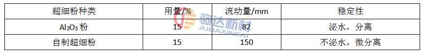 在同一配合比中,對(duì)氧化鋁粉與自制超細(xì)粉(粘土質(zhì))按等重量進(jìn)行互換,分別測定流動(dòng)值。比較二者的作用(見表4),自制超細(xì)粉的性能優(yōu)于氧化鋁粉。