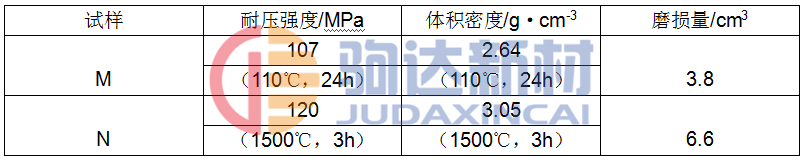 從耐磨性試驗方法可看出,要想得到好的耐磨性,試樣必須有較高的耐壓強度,骨料與基質的硬度較大,骨料與基質的結合強度也應很好。本實驗用的骨料和基質為合成料,其莫氏硬度較高。為7.5~8.5,致密度也高,具有金屬及非金屬的諸多性能。因此研制的澆注料具有較好的耐磨性。為驗證這一點,分別采用合成料和白剛玉為原料,加入相同的添加劑及結合劑,制成高強超耐磨澆注料(M)和低水泥剛玉澆注料(N),測其耐壓強度、體積密度及常溫磨損量,結果見表2。