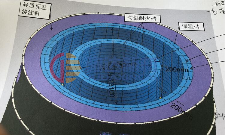 我公司是專業從事耐火材料的生產制造與窯爐的設計安裝工作,主要生產耐火磚有高鋁材質、粘土材質、剛玉材質、碳化硅材質和輕質隔熱耐火磚等耐火材料,近期我公司收到東莞雄冠環?萍加邢薰,發來的30t熱解爐使用耐火材料的分布圖并希望能夠得到我公司在材料與設計安裝上的支持,收到相關資料后我公司設計安裝部門進行了核對,并繪制相關使用的萬能弧耐火磚的設計砌筑方法。雄冠環保提供的熱解爐相關資料。