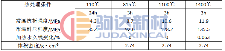 常溫下澆注成型的硅溶膠結(jié)合該剛玉—莫來(lái)石澆注料試樣經(jīng)不同溫度熱處理后的性能見(jiàn)表2。可以看出:烘干后試樣的常溫抗折強(qiáng)度和常溫耐壓強(qiáng)度與普通低水泥高鋁澆注料的相當(dāng);815℃熱處理后試樣的常溫抗折強(qiáng)度和常溫耐壓強(qiáng)度比烘干后的顯著增大,并且隨著熱處理溫度的繼續(xù)升高而繼續(xù)增大,但1400℃熱處理后試樣的性能指標(biāo)與1100℃熱處理后的差別不大。