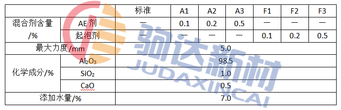 各種低水泥澆注料在進行1min的粉體混合后,添加表1所示的水量混煉5min,然后澆注在40mm×40mm×160mm的模框內。另外,測定熱應力用的試樣澆注在40mm×40mm×100mm的模框內。在20℃的氣溫下養護24h,然后在110℃下干燥24h,以此作為試驗材料。
