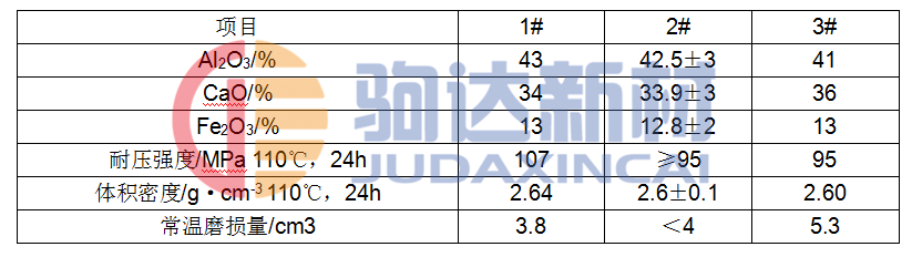 選用高鋁水泥和鋁酸鹽水泥做對比試驗,結果表明高鋁水泥與合成料的親合能力強于鋁酸鹽水泥,故選用高鋁水泥做結合劑。