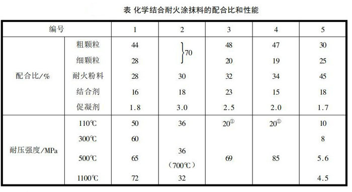 下表為化學結合耐火涂抹料的配合比和性能。水玻璃溶液密度1.38g/cm³,磷酸鋁溶液密度1.56g/cm³。編號1和編號3,分別為黏土熟料和礬土熟料骨料,其顆粒級配:2.5~0.5mm70%,<0.5mm30%:編號2為鋁鉻渣骨料,臨界粒徑為5mm;編號4為剛玉骨料,粗顆粒為16號,細顆粒為80號;編號5為黏土熟料骨粉料,粉料中含12%的軟質黏土,臨界粒徑為5mm;耐火粉料:編號4為混合320 號剛玉粉,其余的為礬土熟料粉,細度小于0.09mm 的占90%以上;編號1和編號2分別用氟硅酸鈉和硅酸鹽水泥作促凝劑。編號3和編號4 摻加1.0%~2.5%的氫氧化鋁粉。編號3~5用鋁酸鹽水泥作促凝劑。