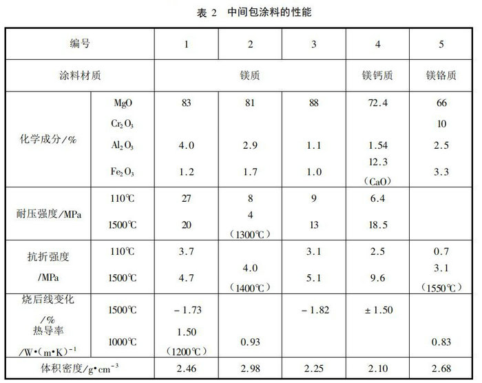 中間包耐火涂抹料簡稱中間包涂料,分為鎂質、鎂鈣質和鎂鉻質3種,其性能見表2。編號1用燒結鎂砂作原材料,其臨界粒徑為3mm,大于1mm的用量35%,1~0.09mm的用量25%,小于0.09mm的用量30%,其余為結合劑和外加物,用水拌和即可使用;編號2與編號1的配制原則,基本相似,小于3mm的耐火骨料55%~65%,耐火粉料30%~40%,軟質黏土約為5%,三聚磷酸鈉3%左右,緩凝劑0.6%~1.0% ,水用量為12%~15%;編號3為優質鎂砂作耐火骨粉料,摻加軟質黏土和SiO2超微粉,結合劑為三聚磷酸鈉,同時摻加防爆劑金屬鋁粉或纖維;編號4以燒結鎂砂為主料,摻加適量的鈣質材料、硅微粉和復合外加劑配制成的,用聚磷酸鹽作結合劑;編號5為鎂鉻質涂料,是由燒結鎂砂、鉻鐵礦、軟質黏土、三聚磷酸鈉和消石灰組成的。