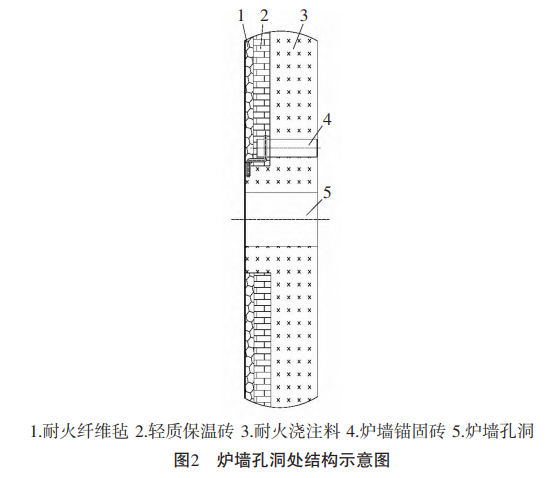 爐襯由耐火纖維氈、硅鈣板(或輕質保溫磚)及低水泥耐火澆注料組成。耐火纖維氈緊靠爐殼安放或放置在輕質磚與低水泥耐火澆注料襯之間。鋼筋拉桿用的固定件厚壁鋼管必須與爐殼鋼板焊接牢固。錨固磚長度應與爐墻總體厚度相配套,以滿足施工要求。錨固磚通過鋼筋拉桿與爐殼連接,且為活動式,錨固磚冷端面與爐殼間距應≥40 mm,這樣可隨著爐墻的漲落而上下移動,也能隨著爐墻的漲縮而 左右移動,保證了爐墻的穩定和使用壽命。