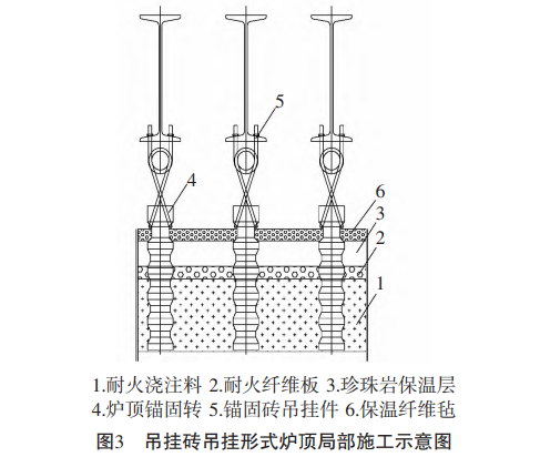 爐頂襯體材料與爐墻材料基本相同,也是由輕、 重質耐火材料配合使用,厚度分別為50~150 mm和 200~300 mm。圖3為吊掛磚吊掛形式的爐頂局部施工 示意圖。吊掛磚一般為直線形布置,其中心距為300~ 350 mm。高溫部位吊掛磚中心距采用下限,反之則采 用上限,這樣可以減少爐頂錨固磚頂面及周圍散熱損失。遇到孔洞時,允許布置成梅花形狀。爐頂四周 的吊掛中心線,應與爐墻工作面保持一定距離。